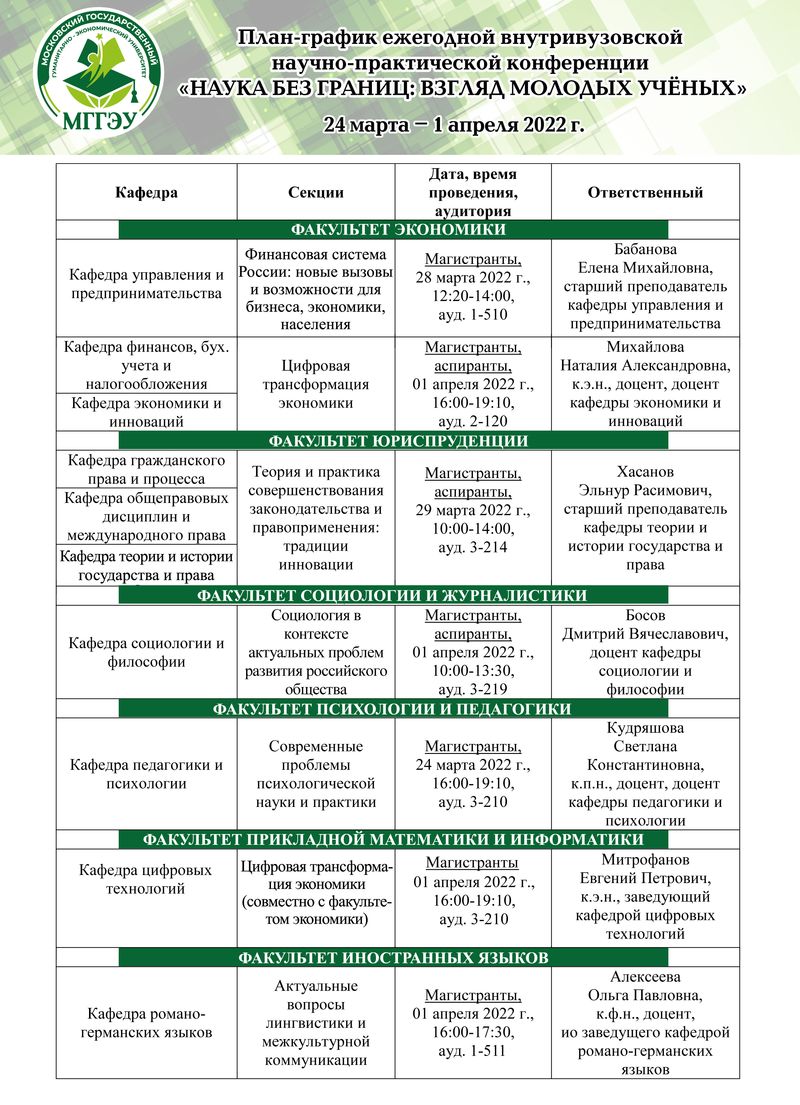 Подготовка докладов участников секций проводится под руководством преподавателей кафедр факультетов экономики, юриспруденции, психологии и педагогики, иностранных языков, социологии и журналистики, прикладной математики и информации.