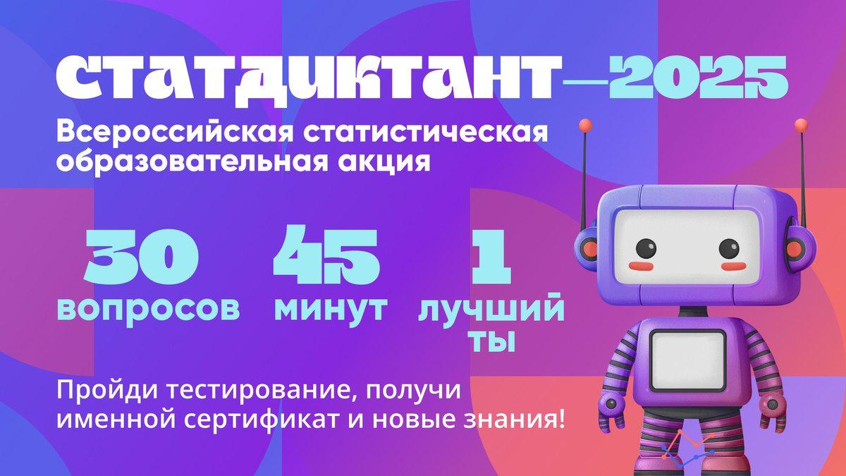 Департамент государственной молодежной политики и воспитательной деятельности Минобрнауки России приглашает принять участие во Всероссийском статистическом диктанте, который пройдет с 7 по 13 октября 2025 года. Мероприятие приурочено к Всемирному дню статистики.